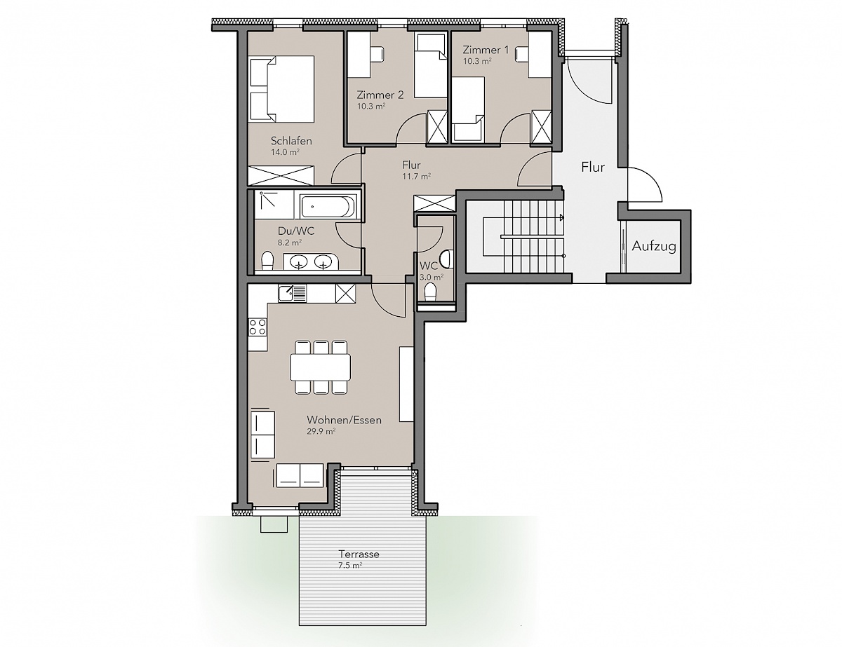 • großer Balkon oder große Terrasse mit Blick ins Grüne